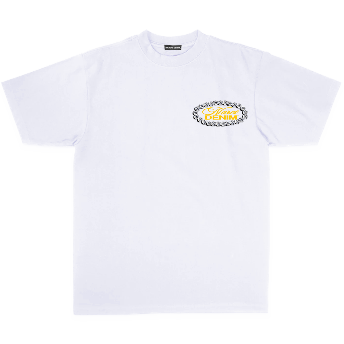 A staple executed with precision. The Diamond Logo Tee pairs a clean white base with our signature Narco Denim script framed in a diamond-set oval, delivering subtle luxury with everyday wearability. Minimal on the front, statement on the back—this piece moves effortlessly from street to upscale.